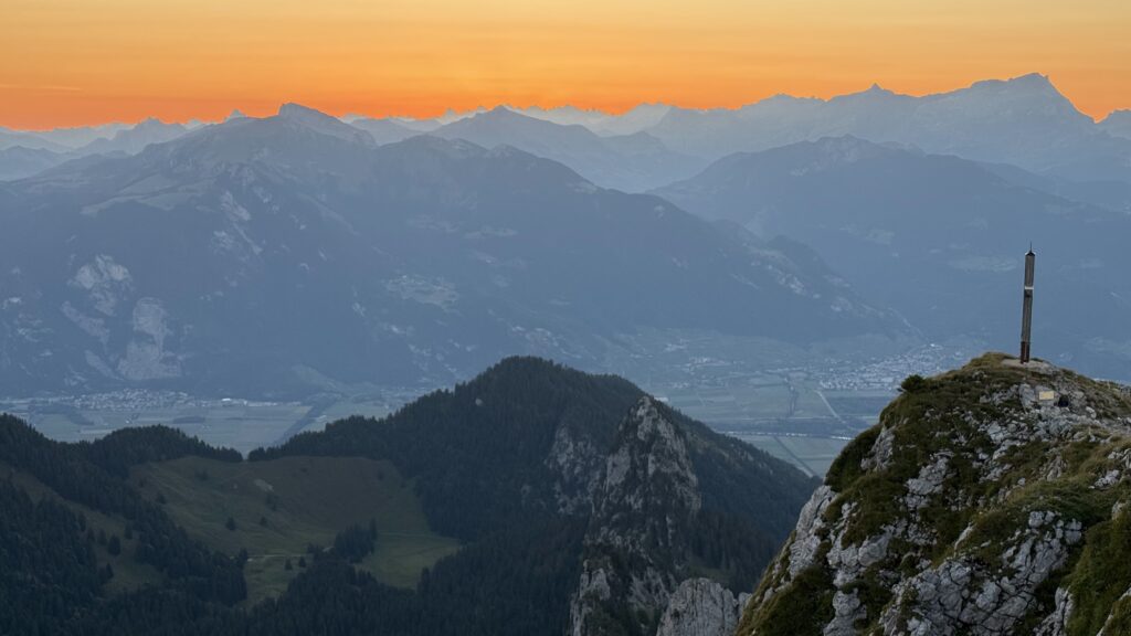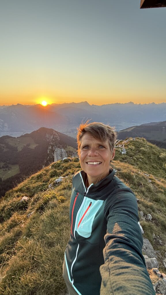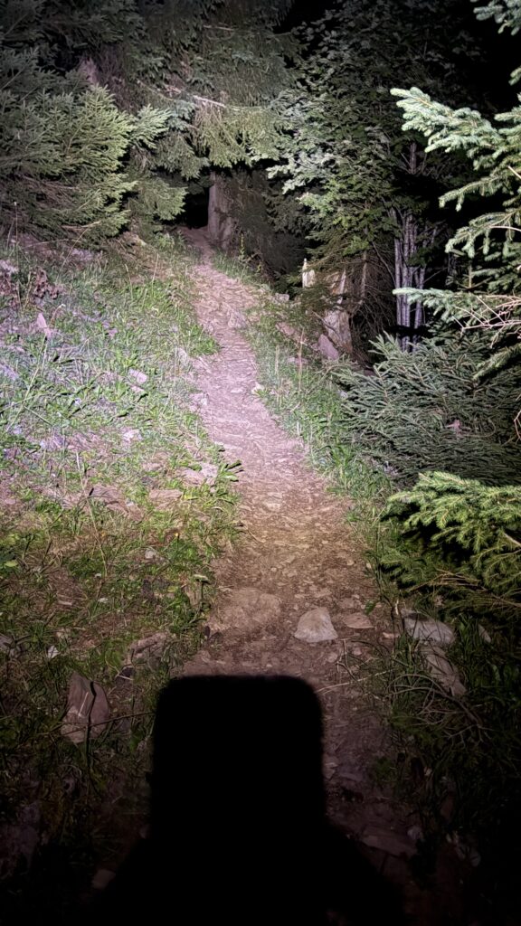 Wat ik nooit eerder deed, was een zonsopgang boven op een berg gadeslaan. Op een gegeven moment in je leven denk je ‘no time like the present’ en ook ‘let’s go’ en dan sta je om 5 uur naast je bed, thee te zetten en je hoofdlamp te monteren. Dit was een bijzonder kort proces. Verstandig als ik was, liep ik niet naar Lac d’Arvouin, maar reed ik mezelf persoonlijk omhoog naar de parking van Sevan Devant. Om iets voor half 6 liep ik door een donker bos met mijn Decathlon hoofdlamp. Vanaf daar was het een kleine 500 meter stijgen naar de top van Linleu, waar ik de zon zou zien opkomen. Halverweg, bijna op de col, zag ik de einder al rood kleuren en ik vreesde aan de late kant te zijn.
