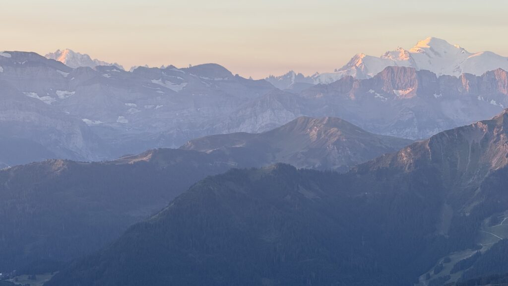 En toen was het zover. De eerste stralen kwamen van achter gindse bergen, de Mont Blanc lag al een beetje te zonnebaden, en eindelijk daar was ie toch, de zon.