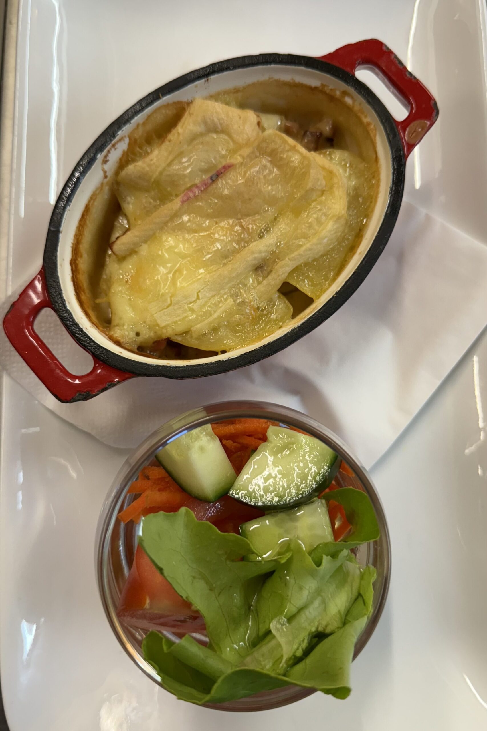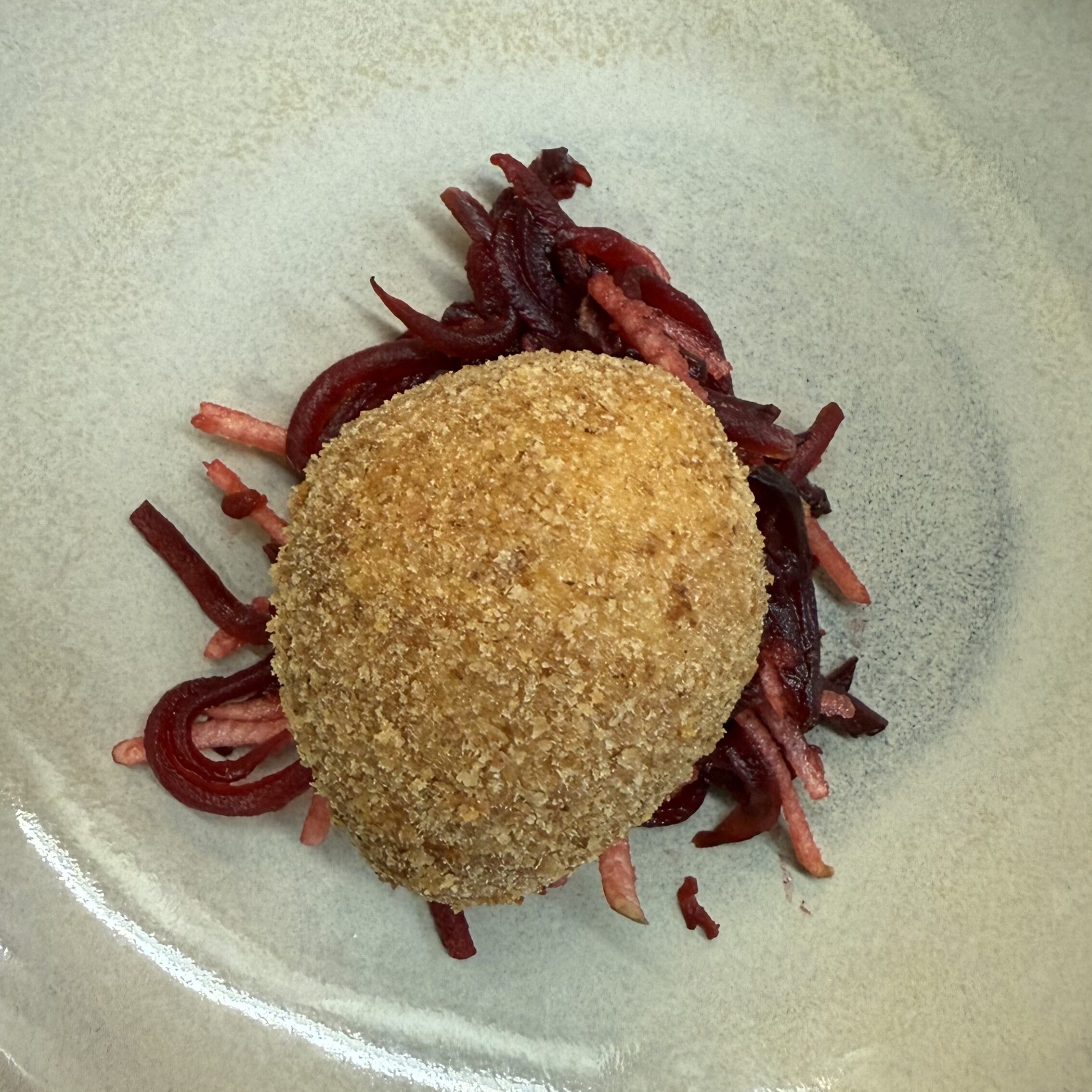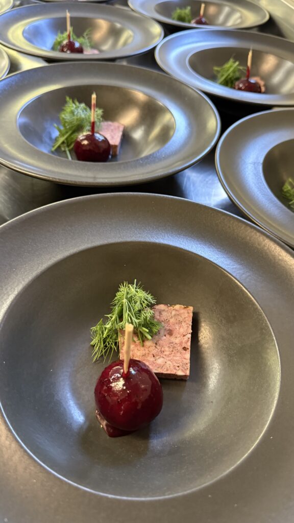 Nu gaan de zaken bergop: het tussengerecht komt eraan. Het tussengerecht is een smaakvolle kroket met als inhoud alle streekkazen, dus de Fontal, Tomme de Savoie en de Abondance, dezelfde kazen die ook op het ontbijtbuffet liggen. De kroket ligt op een bedje van biet en appel. Klinkt goed toch!