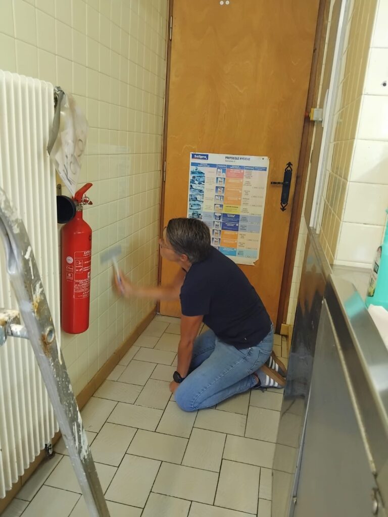 Vrijdag waren we allemaal eerder aan onze dienst begonnen, zodat we alvast konden starten met de grote kuis. Alke heeft een prachtig mooie excel afvinklijst met dingen die moeten gebeuren om het seizoen af te sluiten. En er moet heel wat gebeuren, vergis je niet. Alle kastjes worden leeggetrokken en schoon gemaakt. De koeling moet leeg, want die zal gaan dienen als opslag voor alle dingen die anders niet in kastjes staan. De koeling moet ook proper gemaakt worden, daar begint Adi mee op de laatste dag terwijl wij de kaasfondue serveren. Alle wijn moet weer naar de cave, want de wijnkoeling gaat uit en de kasten in het restaurant moeten de kopjes gaan herbergen. Alle tafels afkuisen, inclusief poten. Stoelen stofzuigen en zo nodig met een doekje bewerken. Het restaurant dweilen. De hoezen van de kussens (!) van de tuin scheiden want die moeten in de was. De tuinmeubelen waren door Alke al binnen gehaald. De hele cave was onder handen genomen en opgeruimd. De tegeltjes in de keuken moeten afgenomen worden. Bestek geteld en gepouleerd. De drankenkoelkast gaat retour naar de cave en moet afgesopt worden. Het koffiemachien krijgt een laatste grote beurt en gaat uit. Zoveel dingen, zonder lijst zou het helemaal niks worden. Voor de keuken kwam Maxime voor de laatste keer helpen, die man kan harder werken dan Adi kan praten.